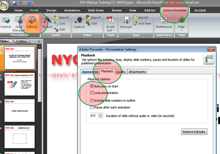 You can loop a presentation by using Adobe Presenter (in PowerPoint) and then selecting ‘Adobe Presenter’>’Settings’>’Playback’>’Loop Presentation’ (Figure 1)
